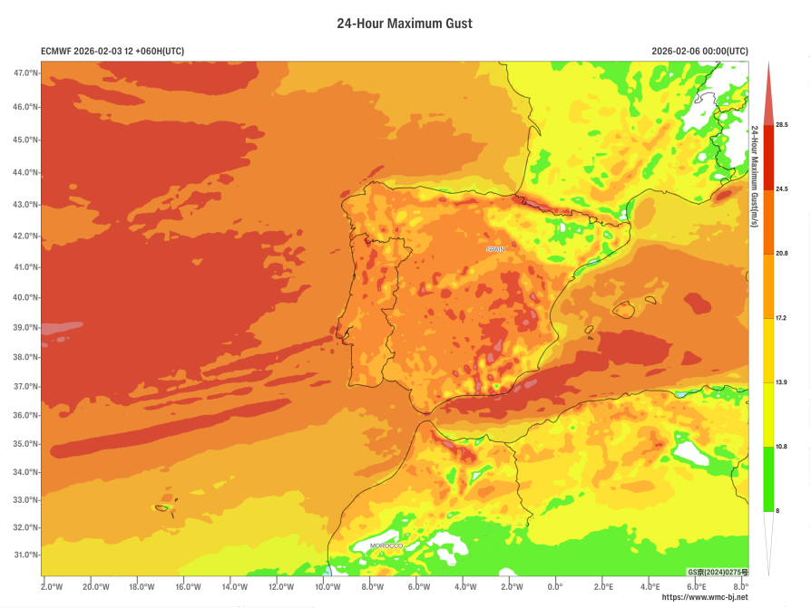 Figure 3 Maximum Gust Speed (Shaded, Unit: m/s) for 24 Hours at 00:00 UTC, February 6, 2026