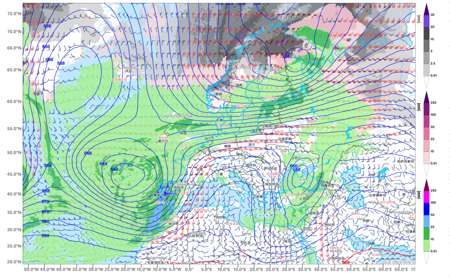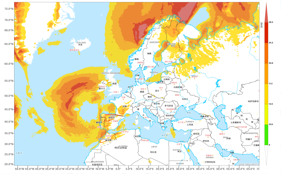 From November 12 to 15, influenced by a stable and slow-moving low vortex, regions including Portugal, Spain, Ireland, the UK, the Netherlands, northern Germany, and southeastern France will experience moderate to heavy rain. Parts of Portugal and western Spain are expected to see heavy downpours or intense rain, with cumulative rainfall totals ranging from 40 to 70 mm in these areas, 80 to 120 mm in some regions, and locally exceeding 150 mm. Additionally, due to the eastward movement of an upper-level trough, heavy to severe snowfall is anticipated in central and northern Norway, northern Sweden, and northern Finland, with localized extreme snowfall (Figure 1). These regions will also experience temperature drops of 4 to 6°C, with some local areas seeing exceeding 8°C. Most of these regions will be accompanied by strong winds of 4 to 6 levels, with gusts reaching 7 to 8 levels, and locally up to 9 to 10 levels (Figure 2). Precautions are advised against the adverse impacts of the heavy rain, strong winds, and snowfall on local power transmission and shipping traffic.