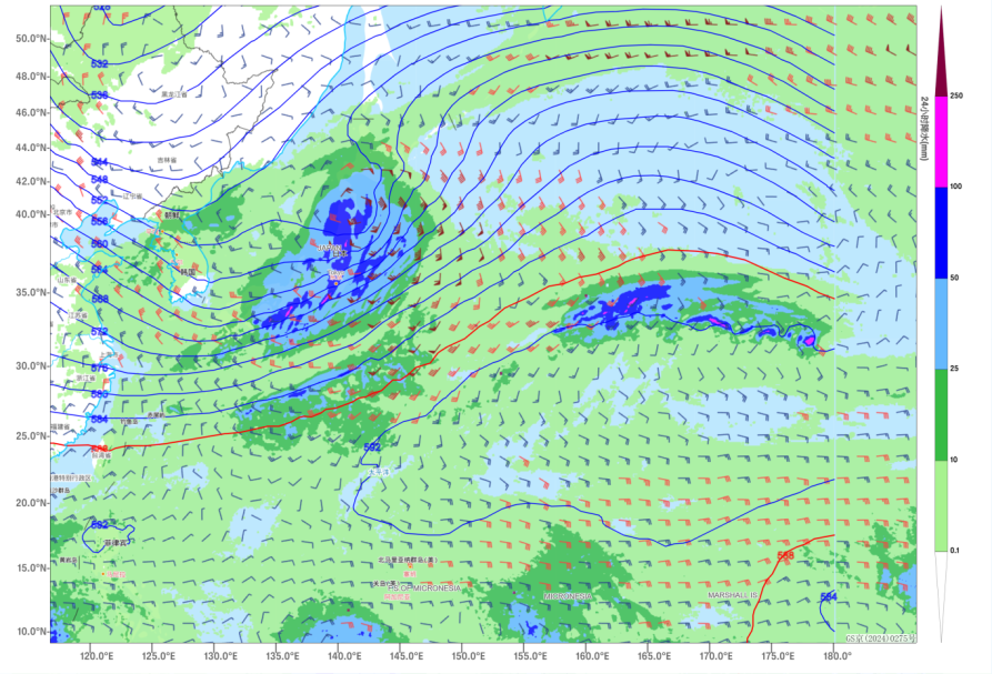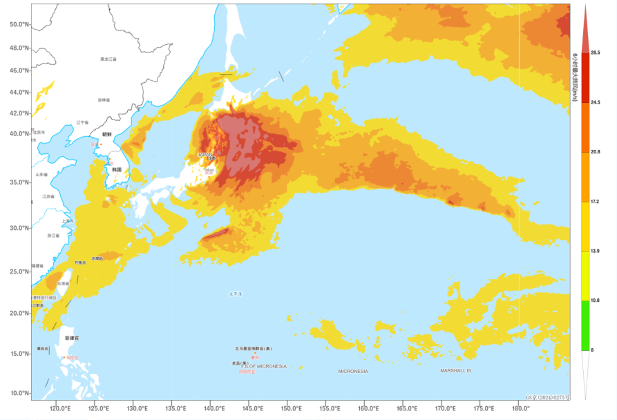 From October 30 to November 2, influenced by a surface cyclone, Japan will experience moderate to heavy rainfall, with some areas facing torrential rain and localized extreme downpours (Figure 2). The cumulative precipitation during this period is expected to reach 30-60 mm, with some regions receiving 70-90 mm and localized areas exceeding 120 mm. This will be accompanied by strong winds of 6-7 on the Beaufort scale, with gusts reaching 8-9 and locally up to 10-11 (Figure 3).