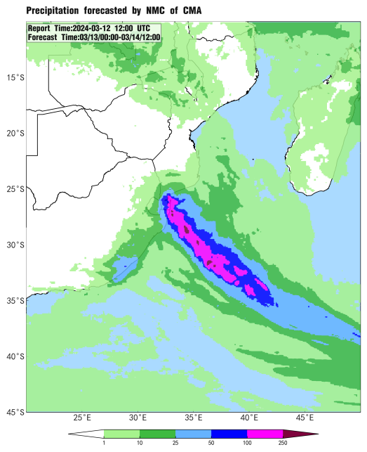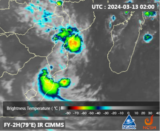 Tropical Cyclone (TC) "Filipo" in the South Indian Ocean rapidly weakened to TD after making landfall in Inhambane Province, Mozambique, around 11 a.m. on the 12th. At 00 UTC 13rd March, the TC center is around 25.0 S, 33.5 E within Gaza Province, Mozambique, with a minimum central pressure of 1002 hPa and maximum sustained winds 15 meters per second. Due to its influence, heavy rainfall observed over southeastern Mozambique on 12nd, with localized severe downpours reported.