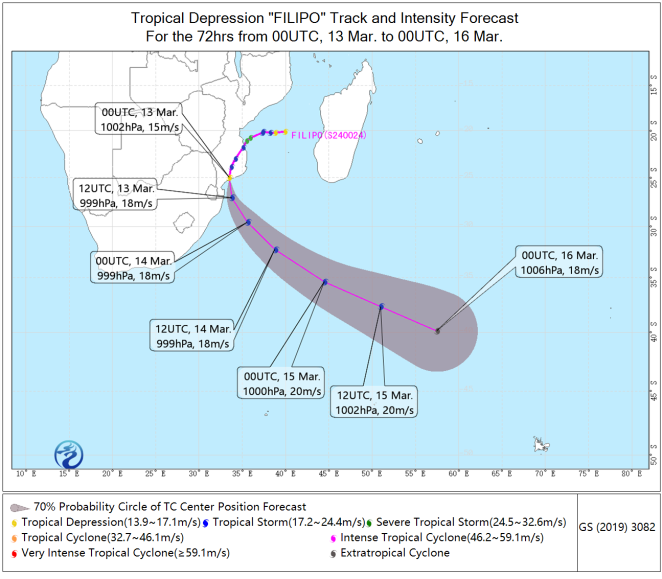 Tropical Cyclone "Filipo" is predicted to fast moving southeastward towards the open water with a speed of 30-40 kilometers per hour, and undergoing extratropical transition on 14th. Its intensity is likely to be maintained or slight intensified. Heavy rainfall including localized torrential downpours are forecasted over southern Mozambique, Swaziland, and eastern South Africa. Gales with coastal gusts exceeding Beaufort scale 8 to 10 is expected.