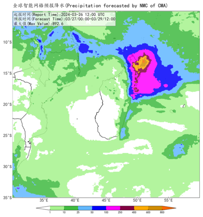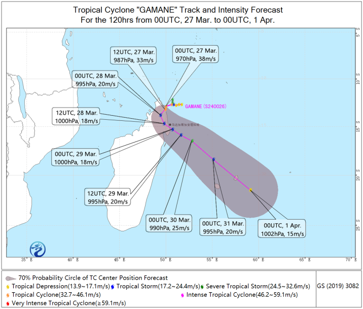 Tropical cyclone "Gamane" in the southwest Indian Ocean was located at 12.9 degrees south latitude and 50.0 degrees east longitude at 08:00 on the 27th March(Beijing time, the same below), with a maximum wind force of 13 (38 m/s, equivalent to typhoon in China), and a central pressure of 970 hPa. Affected by it, heavy rain occurred in the northeastern coast of Madagascar and the northern part of the Mozambique Channel on the 26th, with a local rainfall of more than 300mm in 24 hours.