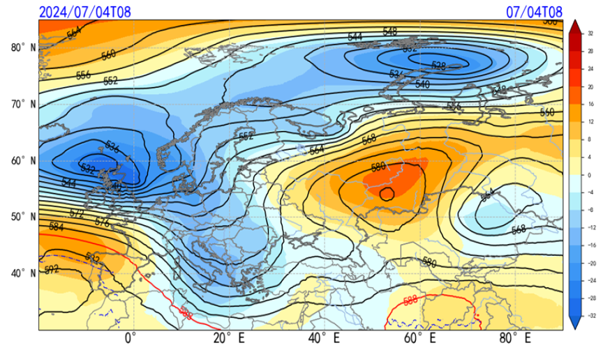 Figure 2: Geopotential height (contours, units: dagpm) and anomalies (shaded) at 500hPa at 0800 BT on July 4, 2024