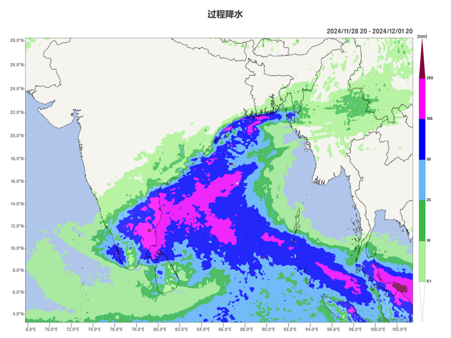 Figure 2 Forecast of accumulated precipitation from 2000 hours on November 28, 2024, to 2000 hours on December 1 (Unit: mm)