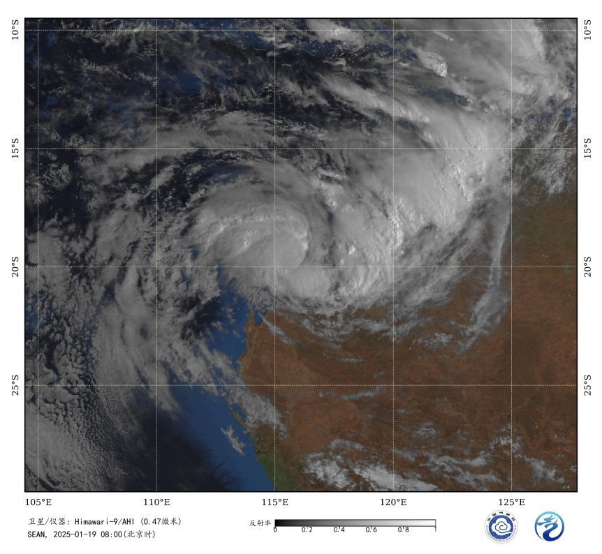 On January 19, 2025, at 08:00 Beijing Time, a tropical cyclone named "SEAN" of category one intensity formed in the waters approximately 330 kilometers northeast of Exmouth, Western Australia (at latitude 19.6 degrees south, longitude 116.1 degrees east), with a central pressure of 989 hPa and maximum sustained winds reaching 9 levels (23 meters per second) (see Figure 1).