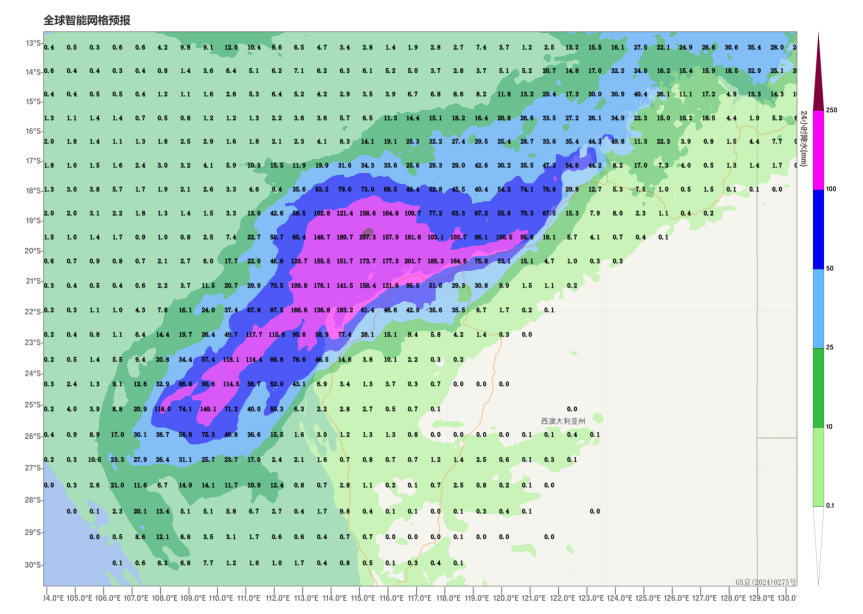 It is predicted that Tropical Cyclone "SEAN" will move southwestward at a speed of 15 to 20 kilometers per hour, with its intensity gradually strengthening. Under its influence, from January 19th to 21st, there will be heavy rain and windy weather in the northwestern part of Australia. The coastal areas of northwestern Western Australia and other regions will experience heavy to severe rainstorms, with locally extremely heavy rain (Figure 2). Parts of the aforementioned areas will experience winds of 5 to 7 levels, with gusts reaching 8 to 10 levels, and there will be winds of 7 to 9 levels with gusts of 10 to 12 levels in the adjacent waters of Western Australia.