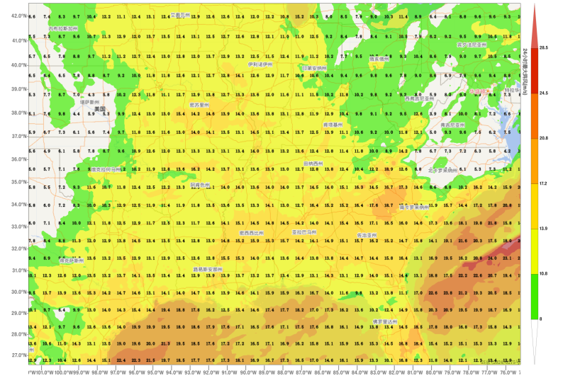 Figure 3. Minimum temperatures in the southeastern United States at 08:00 (local time) on January 22, 2025 (Unit: ℃)