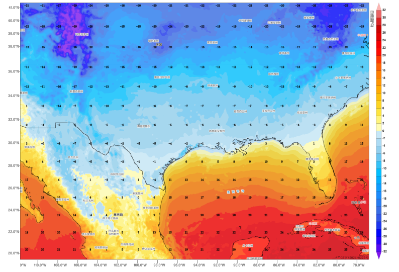 Additionally, parts of the central and eastern United States, as well as northeastern Mexico, will experience a temperature drop of 12 to 16 degrees Celsius, with local cooling in areas such as Mississippi and Alabama exceeding 20 degrees Celsius. By the morning of the local time on the 22nd, the 0-degree Celsius line will be pushed southward to a line extending from northern Mexico to northern Florida (Figure 3).