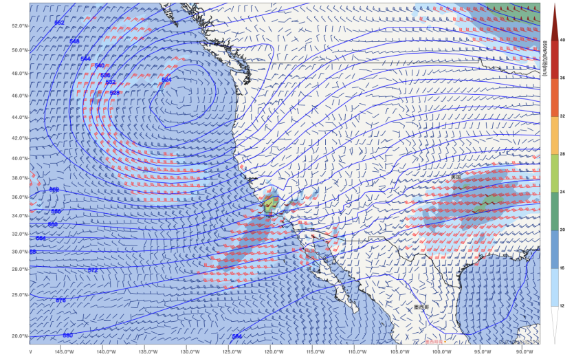Figure 2. Potential height at 500 hPa (contours) and wind field at 850 hPa (barbs) over North America at 20:00 BT (Beijing Time) on February 5th, 2025