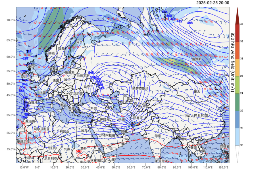 Figure 1: 500 hPa geopotential height (contours) and 850 hPa wind field (barbs) at 20:00 (BJT) on February 25, 2025