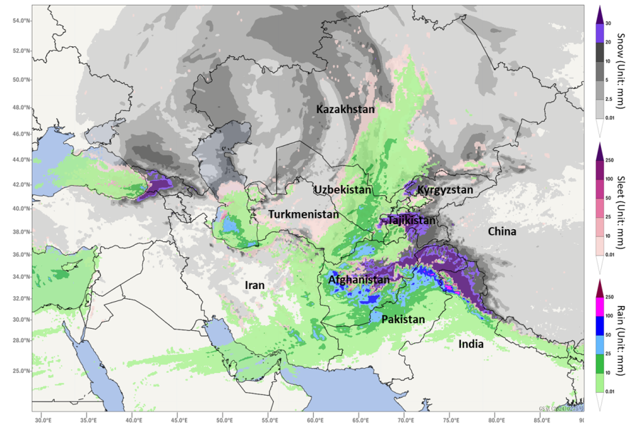 Recently, the southeastern part of Eastern Europe, the western part of Central Asia, and the western part of Western Asia have been affected by a cut-off cold vortex, resulting in rainy and snowy weather with temperature drops. It is expected that from February 24th to 27th, the cold vortex will continue to intensify and move slowly southeastward, controlling the northern parts of Central Asia and Western Asia (Figure 1). The warm and moist airflows from the Mediterranean, the Persian Gulf, and the Caspian Sea, which are incorporated into the cyclonic circulation of the cold vortex, and the cold air mass from high latitudes will converge, bringing widespread rain and snow to the northern part of Central Asia and Western Asia. Moderate to heavy snowfall is expected in Afghanistan, northern Pakistan, Tajikistan, eastern Turkmenistan, eastern Uzbekistan, Kyrgyzstan, and southeastern Kazakhstan. Among these areas, the northeastern part of Pakistan and eastern Tajikistan, under the influence of the uplift of the Pamir Plateau and surrounding mountainous terrain, will experience a significant increase in precipitation, with extremely severe snowstorms locally (Figure 2).