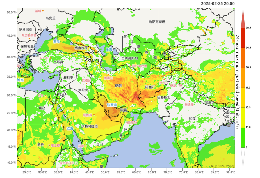 Figure 3 Forecast of 24-hour maximum gust wind speed(Unit: m/s) on February 25, 2025 (BJT)