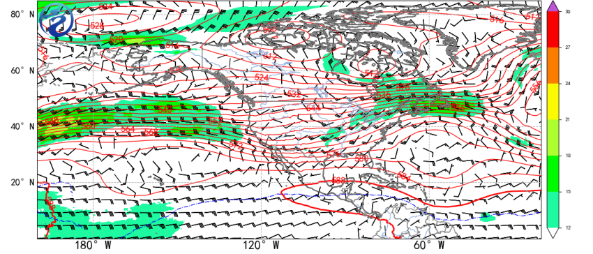Figure 1. Mean geopotential height (contours) at 500 hPa and wind field (barbs) at 850 hPa from March 14 to 18, 2025