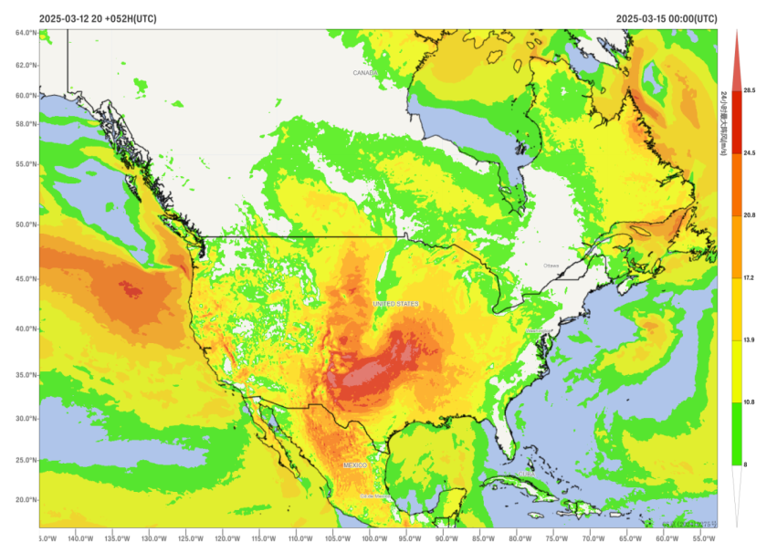 Influenced by the eastward movement of the upper-level trough (Figure 1), most of North America will experience a new round of cold wave weather. It is expected that from March 14 to 18, areas including southern Canada and the Labrador Peninsula, most parts of the United States, northern and eastern Mexico, will successively experience a temperature drop of 8 to 14 degrees Celsius from west to east. Among these, some areas in the northern and eastern United States and the Labrador Peninsula of Canada will see temperature decreases exceeding 18 degrees Celsius. Parts of these areas will also be accompanied by 4 to 6-degree winds, with gusts reaching 7 to 8 degrees, and southern United States gusts may reach 9 to 10 degrees (Figure 2). Southern Canada, the western and northern United States will experience moderate to heavy snow or sleet, with locally severe blizzards; the Labrador Peninsula of Canada, the coastal areas of the western United States, and the central and eastern regions will receive moderate to heavy rains, with locally heavy rainstorms (Figure 3); the southeastern United States will experience severe convective weather such as hail and tornadoes.