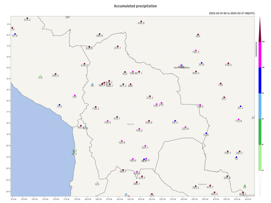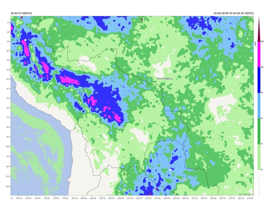 Looking ahead, forecasts indicate that from March 28 to April 2, scattered light to moderate showers will continue. However, in the areas hardest hit by the downpours—particularly parts of southern Beni, southern La Paz, and Cochabamba—expectations are for heavy rain or storm conditions, with some locations likely to experience intense, localized downpours (see Figure 2).
