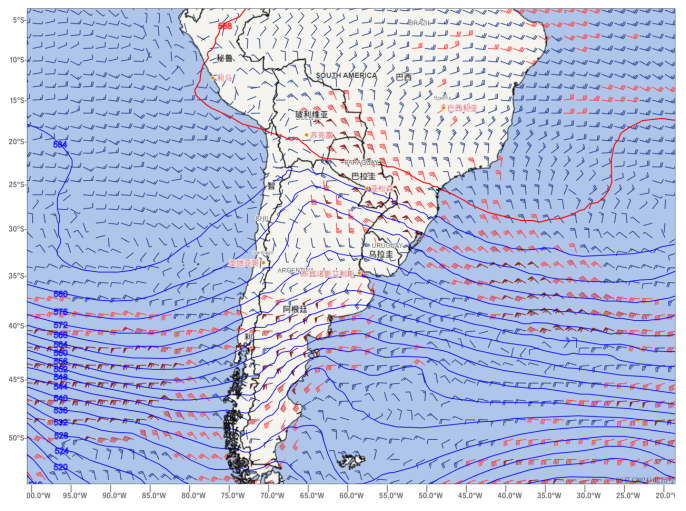 Figure. 1 500 hPa Geopotential Height (Isopleths) and 850 hPa Wind Field (Wind Barbs) at 12:00 UTC, May 9, 2025