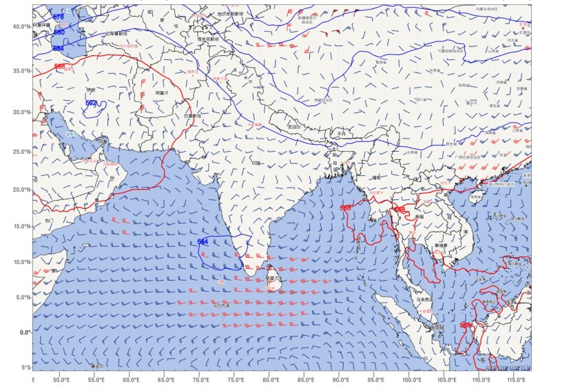 Figure 1: 500 hPa Geopotential Height (Isopleths) and 850 hPa Wind Field (Wind Barbs) at 00:00 UTC, May 20, 2025