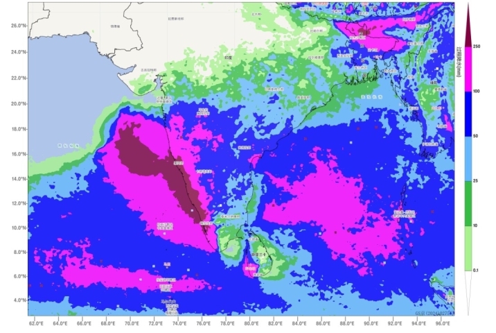 Affected by a tropical low-pressure system and low-level jet streams (Figure 1), it is expected that the central and southern parts of India, Bangladesh, and Sri Lanka will experience frequent precipitation over the next week. In regions such as Kerala, Goa, and Karnataka in India, heavy to extremely heavy rain is anticipated, accompanied by short-duration intense rainfall (with localized hourly rainfall exceeding 60 mm), thunderstorms, strong winds, or hail. The cumulative precipitation in most of these areas is expected to range from 30 to 60 mm, with some regions receiving 80 to 150 mm, and localized areas potentially exceeding 350 mm (Figure 2). In certain parts, rainfall is likely to reach or surpass historical extremes for the same period, necessitating close monitoring for potential geohazards triggered by the intense rainfall.