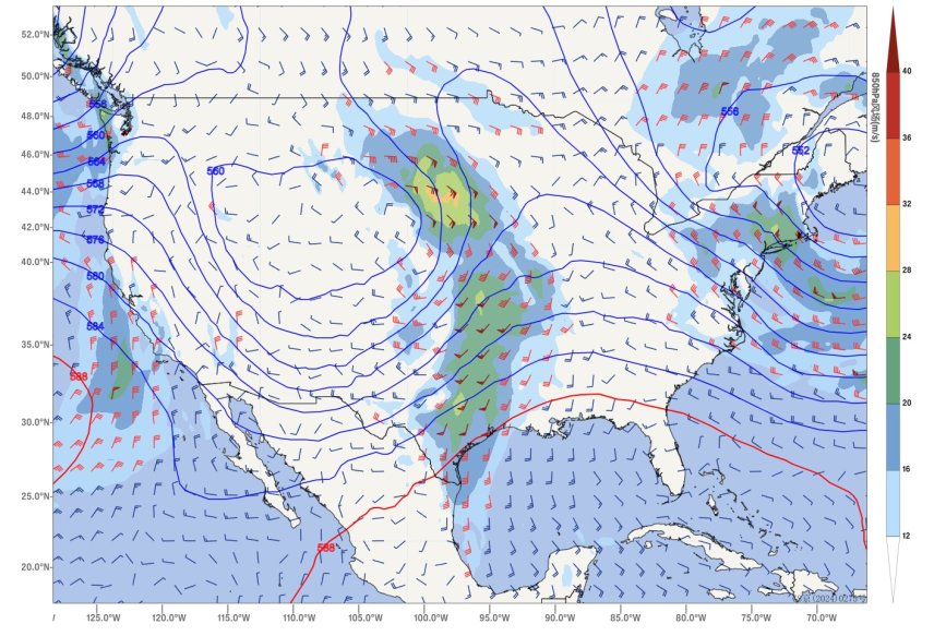 Figure 1: 500 hPa Geopotential Height (Isopleths) and 850 hPa Wind Field (Wind Barbs) at 1200 UTC on May 19, 2025