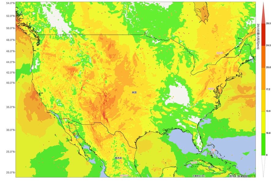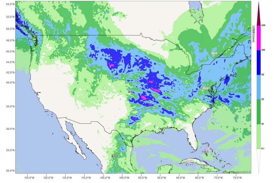 Affected by the combined influence of an upper-level trough and a low-pressure vortex (Figure 1), it is expected that from May 19 to 24, a significant stormy weather pattern will develop from west to east across most of the United States. Moderate to heavy rain is anticipated in parts of the central and eastern regions, with localized severe or extreme downpours in areas including South Dakota, Missouri, Oklahoma, and Texas. Parts of the central and southern U.S. will experience severe convective weather, including short-duration intense rainfall, thunderstorms with strong winds, hail, and tornadoes (Figure 2). Additionally, most of the Midwest will see winds of 5 to 7 on the Beaufort scale, with gusts reaching 9 to 11 in some areas (Figure 3).