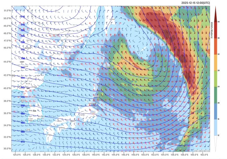 Affected by a extratropical cyclone cyclone (Figure 1), on December 14th, Japan experienced catastrophic windy conditions. Most regions were hit by gales of 6-7 on the Beaufort scale, with gusts reaching 8-9. In coastal areas and parts of Miyagi Prefecture, localized gusts soared to 9-10 on the Beaufort scale.