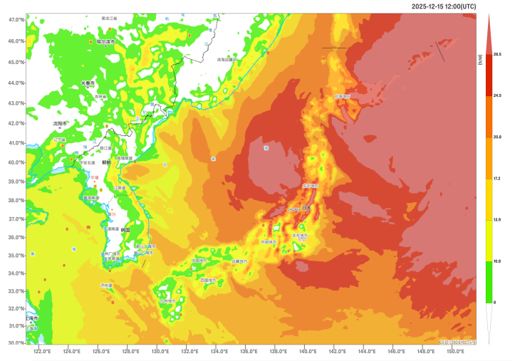 Figure 2 Maximum Gust Speeds in 24 Hours as of 12:00 (UTC) on December 15 (Unit: m/s)