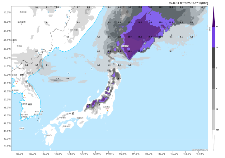 Figure 3 Accumulated Snowfall from 12:00 on December 14 to 12:00 on December 17 (UTC, Unit: mm)