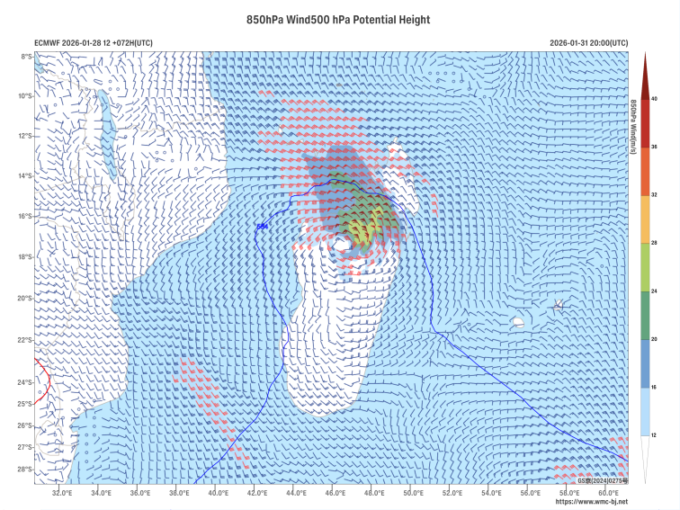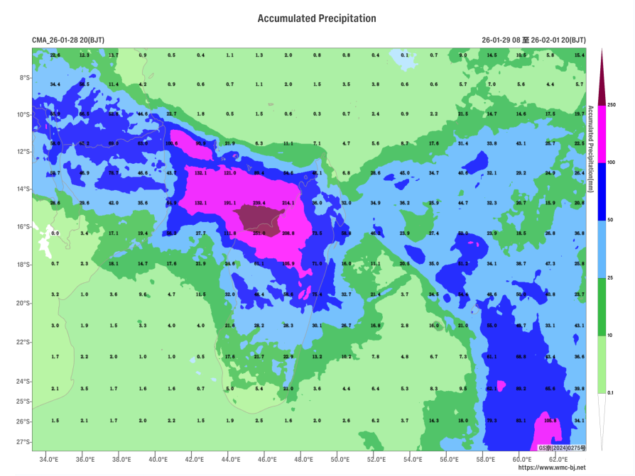 Affected by a tropical low-pressure system in the Mozambique Channel (Figure 1), it is expected that from January 29 to February 1, 2026, regions including central and northern Madagascar, southeastern Tanzania, northeastern Mozambique, Malawi, Comoros, Mauritius, and Réunion will experience moderate to heavy rainfall, with localized downpours and some areas facing extreme rainfall. The cumulative precipitation in these regions is anticipated to be between 40 and 90 mm, with some areas receiving 120 to 220 mm, and locally exceeding 250 mm (Figure 2). These conditions will be accompanied by severe convective weather, including short-duration intense rain and thunderstorms with strong winds (Figure 3). Precautions are advised against potential secondary disasters such as flooding, landslides, mudslides, and urban waterlogging, as well as adverse impacts on power facilities, transportation, and other sectors in the affected areas.