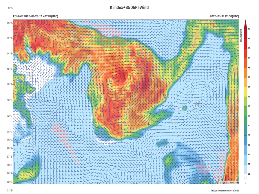 Figure 3 850 hPa Wind Field (wind barbs, units: m/s) and K-Index (shaded, units: °C) at 12:00 (UTC) on January 31, 2026