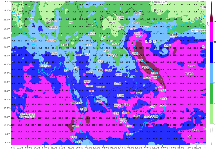 Persistent heavy rainfall is occurring in the eastern and southern parts of the Indochinese Peninsula