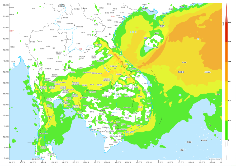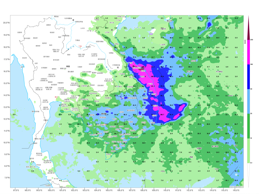 Affected by Typhoon "KOTO" from December 2 to 5, strong winds and heavy rain are expected in the eastern and southern regions of the Indochinese Peninsula. Specifically, parts of the central and the southern Vietnam, southern Laos, and Cambodia will experience moderate to heavy rain, with localized areas facing torrential or extreme downpours. These areas will also be accompanied by strong winds of 4 to 5 on the Beaufort scale, with gusts exceeding 7 levels (Figure 2). Accumulated precipitation in most of these areas will range from 30 to 50 mm, with some regions receiving 70 to 100 mm, and locally exceeding 200 mm (Figure 3). The intense rain and wind are likely to disrupt power facilities, transportation, and cause the collapse of buildings. There is a high risk of secondary disasters such as flooding, landslides, and mudslides, necessitating advance precautions.