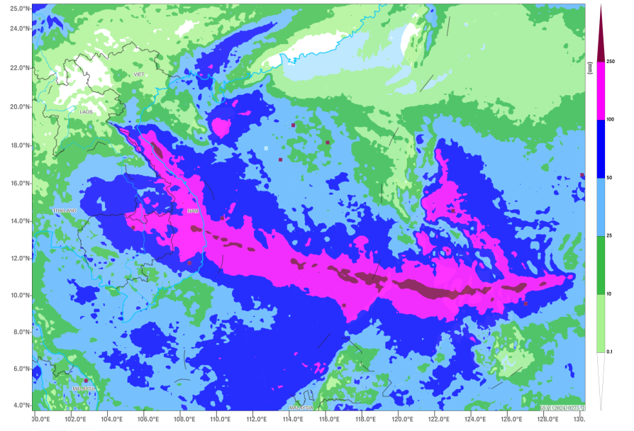 Affected by Typhoon "KALMAEGI" heavy to torrential rain is expected in central Philippines and its adjacent waters from November 3 to 4, accompanied by winds of 8-10 levels, with gusts exceeding 12 levels. Around November 7, the southern part of the Indochina Peninsula will start to be impacted, with moderate to heavy rain in central and southern Vietnam, southern Laos, northern Cambodia, and eastern Thailand. Some areas will experience torrential or extremely heavy rain, and coastal regions will also be hit by strong winds. The cumulative precipitation in most of these areas is expected to reach 60-120 mm, with some regions receiving 160-220 mm, and localized areas exceeding 250 mm (Figure 2). Attention should be given to the adverse effects of the intense wind and rain on power facilities, transportation, and other industries, as well as the potential for localized heavy rainfall to trigger secondary disasters such as flooding, landslides, mudslides, and urban waterlogging.