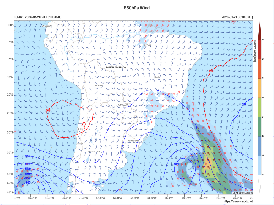 Figure 1 Forecast of 500 hPa Geopotential Height (units: dagpm) and 850 hPa Wind Field at 08:00 (BJT) on January 21, 2026 (units: m/s)
