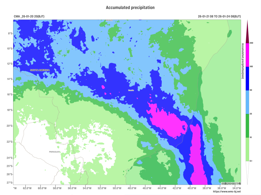 Affected by a low-pressure trough (Figure 1), it is expected that from January 21 to 23, 2026, central and southeastern Brazil will experience moderate to heavy rainfall, with some areas facing torrential rain and localized extreme downpours. The regions most likely to be impacted include Mato Grosso, Goiás, the Federal District, Minas Gerais, Espírito Santo, and Rio de Janeiro. The cumulative rainfall during this period is anticipated to be between 50 and 90 mm with some areas receiving 120 to 180 mm and localized regions exceeding 200 mm (Figure 2). This heavy precipitation will be accompanied by severe convective weather, including short-duration intense rainfall and thunderstorms with strong winds (Figure 3). Precautions are advised against potential secondary disasters such as flooding, landslides, debris flows, and urban waterlogging in the aforementioned regions, as well as adverse impacts on power facilities, transportation, and other sectors.