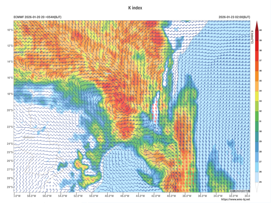 Figure 3 Forecast of 850 hPa Wind Field (wind barbs, units: m/s) and K-Index (shaded, units: °C) at 02:00 (BJT) on January 23, 2026