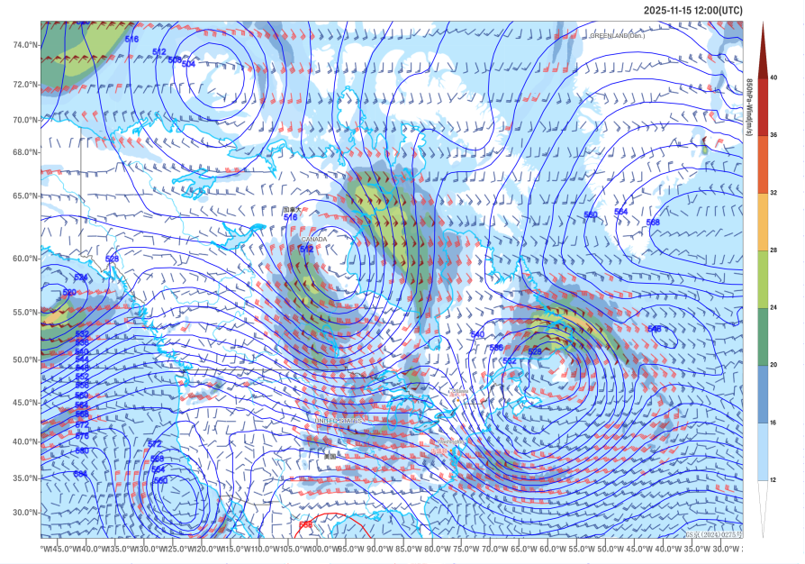 Figure 1 500 hPa Geopotential Height (units: dagpm) and 850 hPa Wind Field (units: m/s) at 12:00 (UTC) on November 15