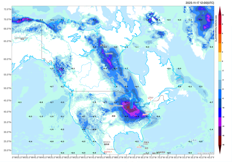 Figure 2 48-hour Temperature Change Forecast at 2 meters above ground level as of 12:00 (UTC) on November 17 (Unit: °C)