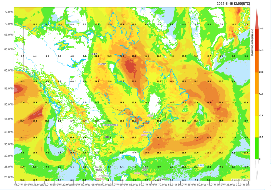 Figure 3 Maximum Gust Wind Speed (Unit: m/s) for 24 Hours as of 12:00 (UTC) on November 16