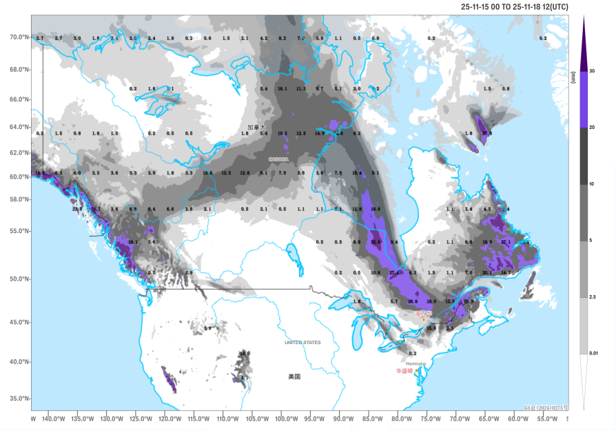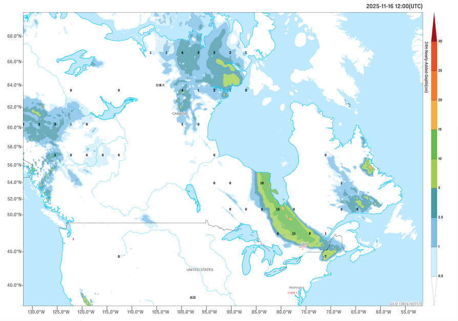 Affected by an upper-level cold vortex, it is expected that from November 15 to 18, a strong cold air mass will impact the central and eastern regions of North America from north to south (Figure 1). Average temperatures in southern Canada and the central and eastern United States will drop by 6 to 10°C, with localized cooling of 12 to 16°C (Figure 2). These areas will also experience winds of 5 to 6 on the Beaufort scale, with gusts of 7 to 8, and along the eastern coast of the United States, gusts could reach 9 to 10 (Figure 3). Parts of central and eastern Canada and northeastern United States will see heavy to severe snowfall (or sleet), with localized extreme snowfall events. Accumulated snowfall during this period is expected to reach 16 to 20 mm, with some areas exceeding 30 mm (Figure 4). New snow accumulation depths will range from 6 to 10 cm, with localized depths potentially exceeding 14 cm (Figure 5). Precautions should be taken against the adverse effects of the snowfall, strong winds, and cooling on local power transmission, shipping, and transportation.