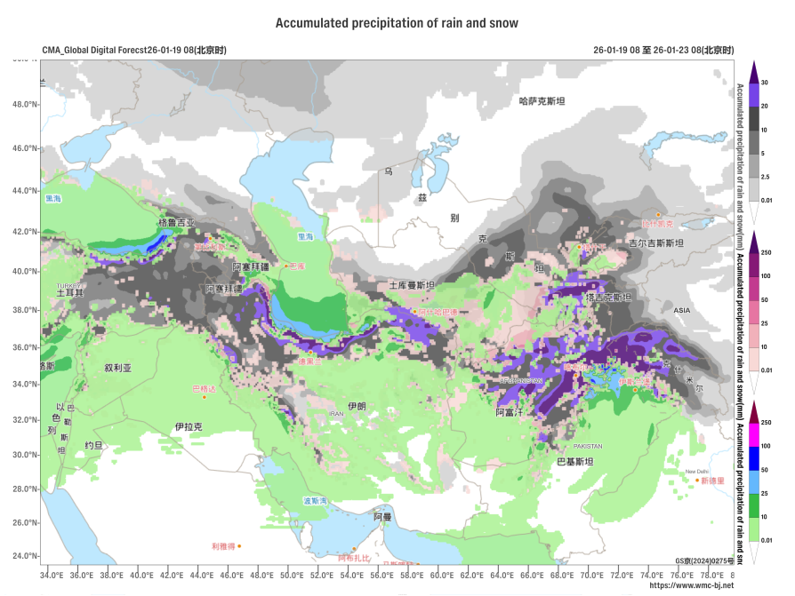 Figure 1: Accumulated Precipitation (Rain and Snow) in Central and Western Asia (Unit: mm, Forecast initiated at 08:00 on January 19, 2026, Period: 2026011908-2026012308,BST)