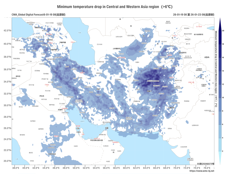 Figure 2: Minimum Temperature Drop (>6°C, in °C) in Central and Western Asia (Forecast starting from 08:00 on January 19, 2026, Period: 2026011908-2026012308,BST)