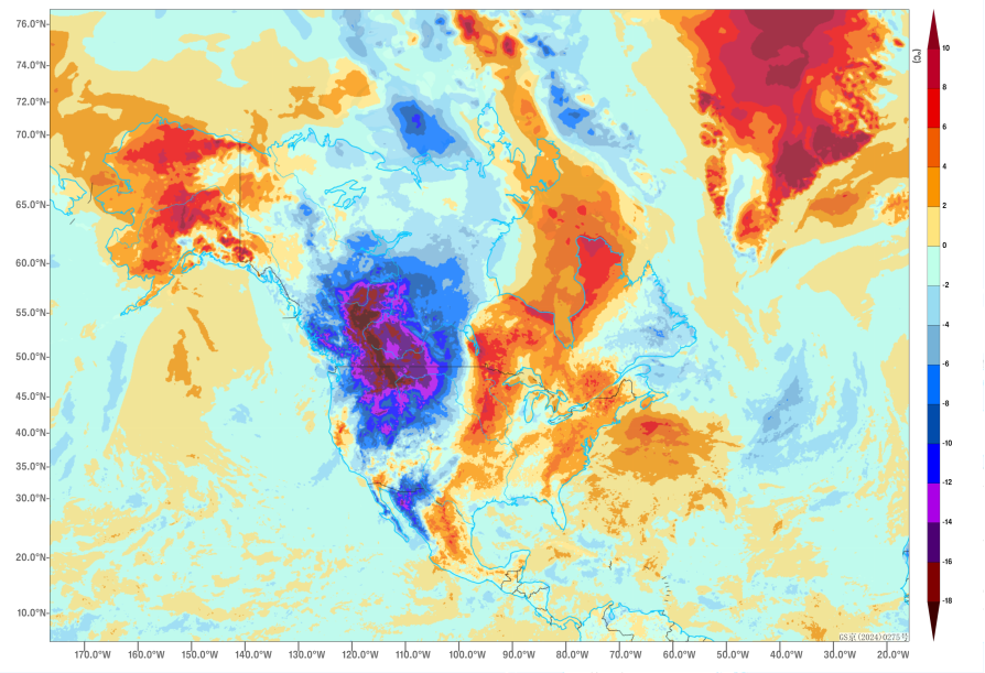 Figure 1 Forecast of 48-hour Temperature Change at 2 meters above ground level(Unit: °C) at 00:00 UTC on October 13