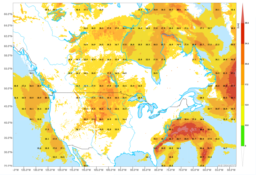 From October 11 to 14, influenced by the eastward movement of a deep upper-level trough, parts of southern Canada and northern United States will experience a temperature drop of 8 to 12°C, with localized drops exceeding 14°C (Figure 1). This will be accompanied by strong winds of 5-6 on the Beaufort scale, with gusts reaching 7-8 and locally reaching 9-10 (Figure 2). Additionally, regions including Alaska, northern Canada, Manitoba, Alberta, and the northwestern United States will occur medium to heavy snowfall, with localized blizzard or severe blizzard conditions. The cumulative snowfall during this period is expected to range from 5 to 20 mm, with some areas exceeding 30 mm. Central-eastern Canada and the central-western United States will occur medium to heavy rainfall, with localized heavy rainstorms (Figure 3). Precautions should be taken against the adverse impacts of strong winds, cooling, and precipitation on local power transmission and transportation systems.