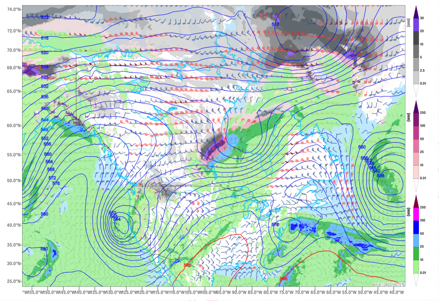 Figure 3 Forecast of 24-hour rainfall and snowfall (units: mm), 500 hPa geopotential height(contours), and 850 hPa wind field(barbs) at 00:00 UTC on October 14