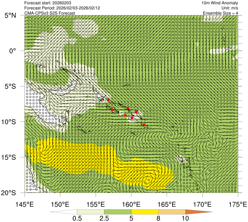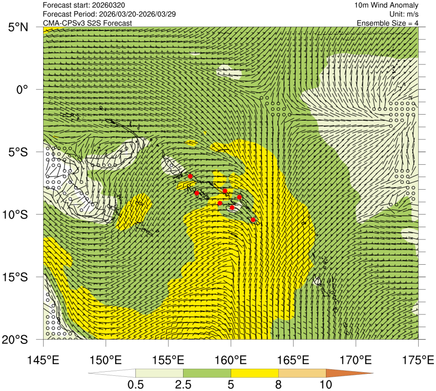 • 10-day rolling 10m wind field and the wind speed anomaly distribution