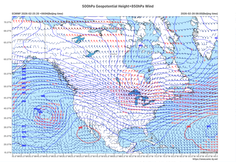 Figure 1 500 hPa Geopotential Height (units: dagpm) and 850 hPa Wind Field (units: m/s) at 08:00 (Beijing Time) on February 28, 2026