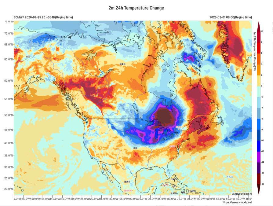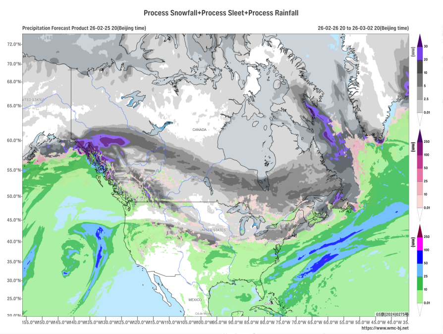 Affected by the deepening of a cold vortex and an upper-level trough (Figure 1), a new round of severe cold air is expected to hit central North America from February 26 to March 1. Most of these regions will experience a temperature drop of 6-10℃, with localized areas seeing more than 14℃ (Figure 2). This will be accompanied by winds of 5-6 on the Beaufort scale, with gusts reaching 7-9. The coastal high-altitude areas of western Canada, the southeastern part of Canada, and the northeastern United States will see moderate to heavy snow, with localized blizzard or severe blizzard conditions. Accumulated precipitation is expected to range from 10-20 mm, with some areas exceeding 35 mm (Figure 3). Attention should be paid to the adverse effects of strong temperature drops and snowy weather on transportation and travel.