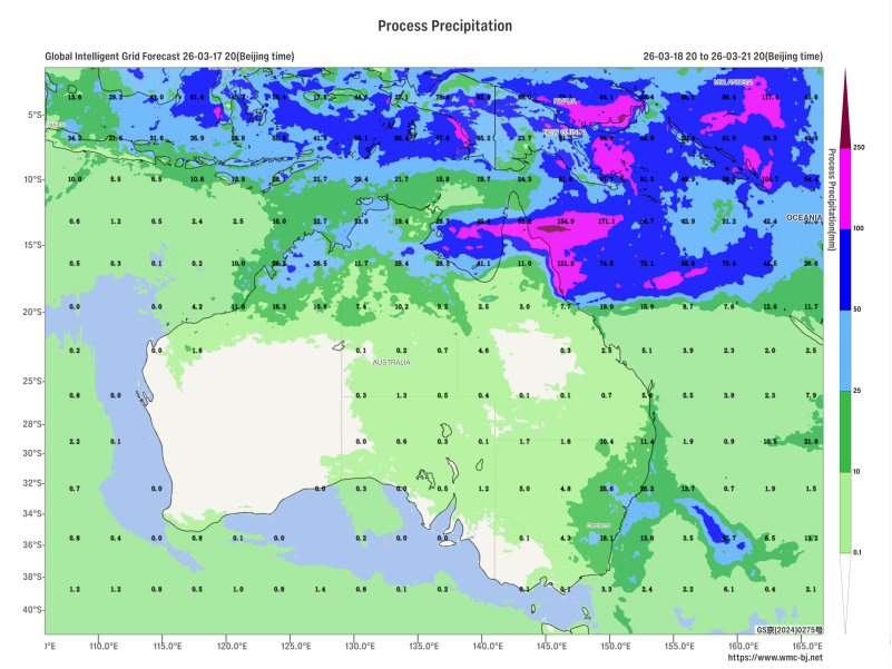 Tropical Cyclone "Narelle" is expected to move westward at a speed of 15-20 km/h, gradually intensifying (Figure 1). As a result, over the next three days, northern Australia, Papua New Guinea, and the Solomon Islands will experience moderate to heavy rainfall, with localized heavy downpours or intense rain, accumulating 50-70 mm, and exceeding 250 mm in some areas (Figure 2). These regions will also be accompanied by winds of 4-6 on the Beaufort scale, with gusts reaching 8-9. Additionally, parts of Indonesia will see moderate to heavy rainfall, with localized heavy downpours or intense rain. Caution is advised against secondary disasters triggered by strong winds and heavy precipitation.