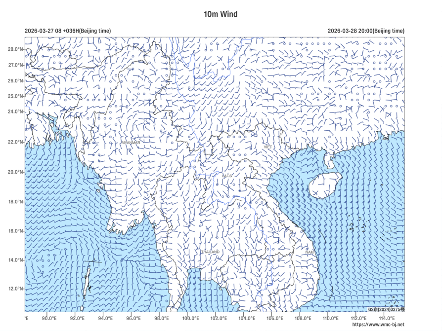 According to the latest monitoring data from the Fengyun satellite, significant biomass burning hotspots have been detected in the Indo-China Peninsula, leading to a substantial increase in atmospheric particulate matter concentrations. From March 28 to 30, apart from the northern part of Myanmar experiencing notable precipitation (Figure 1), no significant rainfall was observed in other countries within the Indo-China Peninsula. Additionally, most regions in the Indo-China Peninsula experienced weak wind conditions (Figure 2), resulting in poor atmospheric dispersion conditions, which are conducive to pollutant accumulation. It is expected that, influenced by biomass burning, over the next three days, areas including eastern Myanmar, northern Thailand, central and northern Laos, central and northern Vietnam, and northern Cambodia will experience haze, accompanied by widespread low visibility conditions.