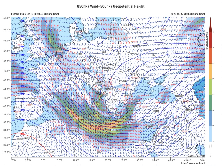 Figure 1 500 hPa Geopotential Height (units: dagpm) and 850 hPa Wind Field (units: m/s) at 20:00 (Beijing Time) on February 17, 2026
